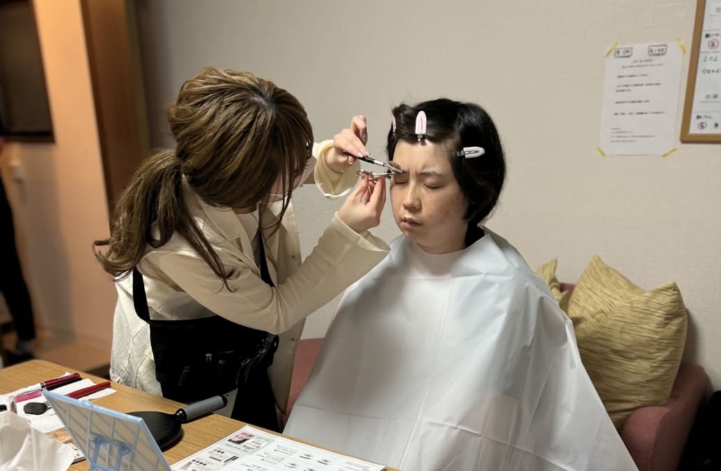 健常者が当たり前とする「美容室に行く」というのは遠い存在。そこで、ケアの一環として美容スタッフが訪問。メイクアップ・ヘアアレンジ・アイブロウケア・マニキュアなどのメニューを体験して頂き、同時に頭髪・皮膚・爪のコンディションから衛生面や健康面の状態を確認しています。また、スキンシップやコミュニケーションを通じた社会との接点として。私たちにできる生活に即した支援活動を継続して行っています。