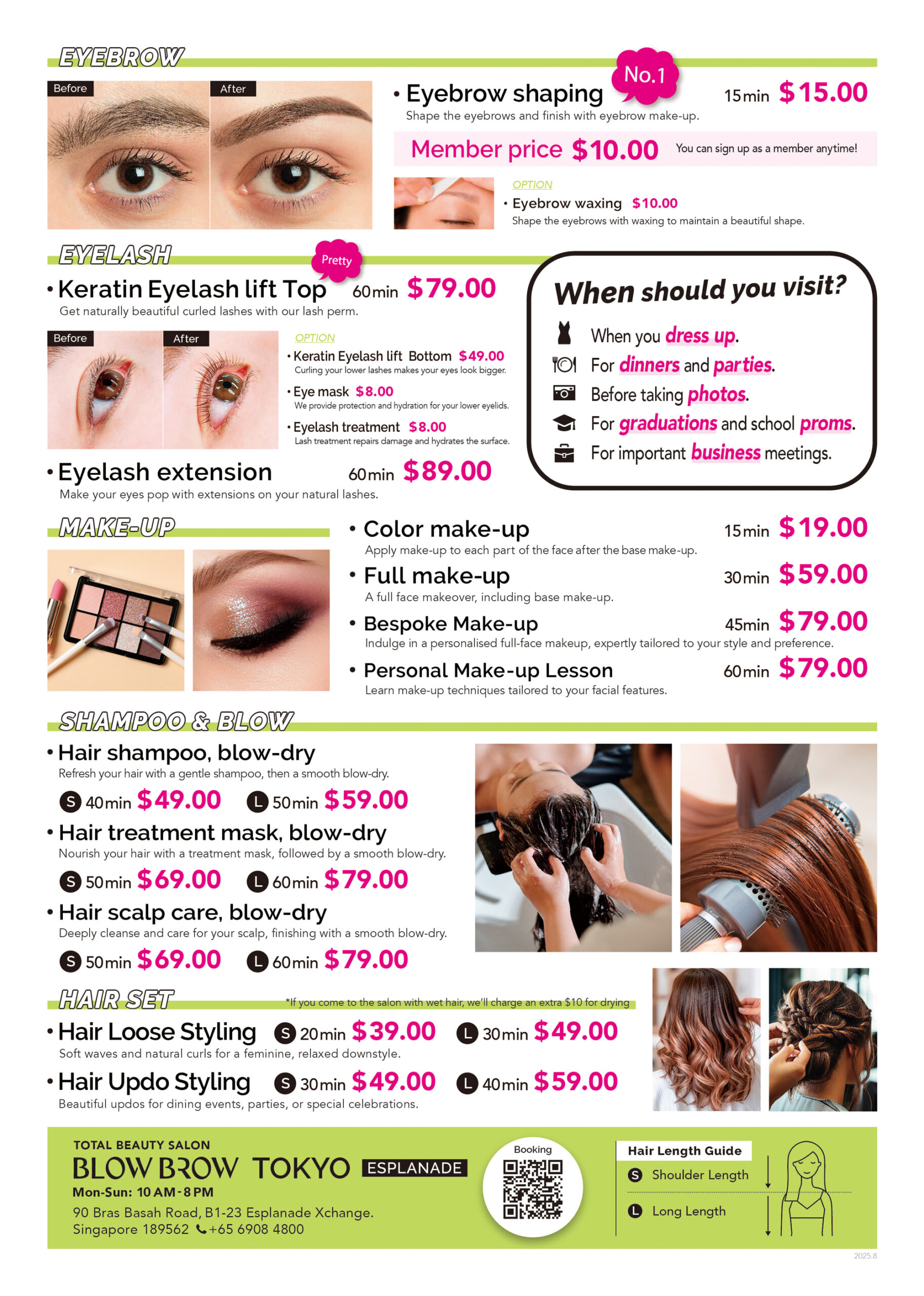 短時間のシャンプー&ブローから特別なヘアセット、フルメイク、アイブロウまで、メニューが充実。料金も手頃で、日常使いから記念日まで、さまざまなシーンに合わせて選べます。