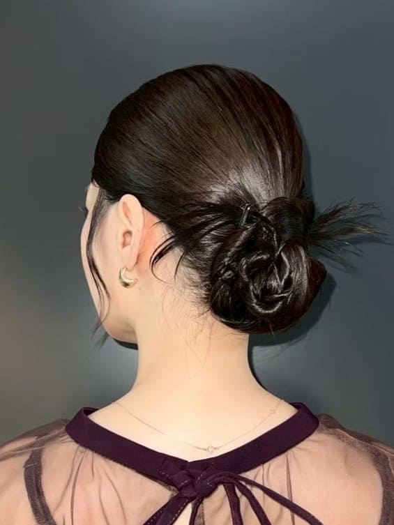 ヘアは、キレイめスタイルに相性の良いまとめ髪をご提案。